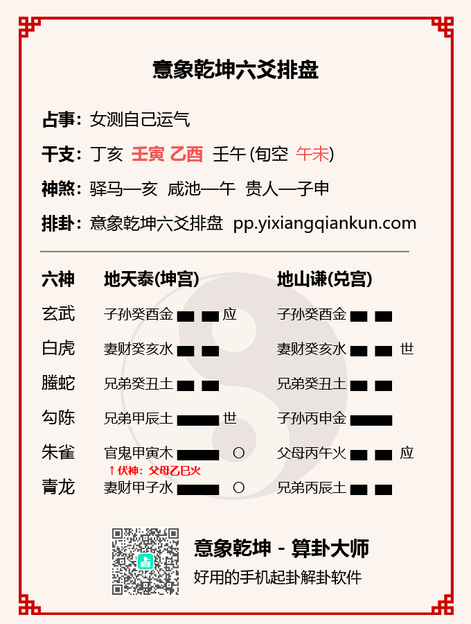 這裡給大家分享一則地天泰卦測自身運氣運勢變地山謙卦的卦例,此卦寅月乙酉日起卦,兄弟爻持世臨勾陳,官鬼爻發動變父母爻,妻財爻發動變兄弟爻回頭克,下面我們就一起具體看一下。
